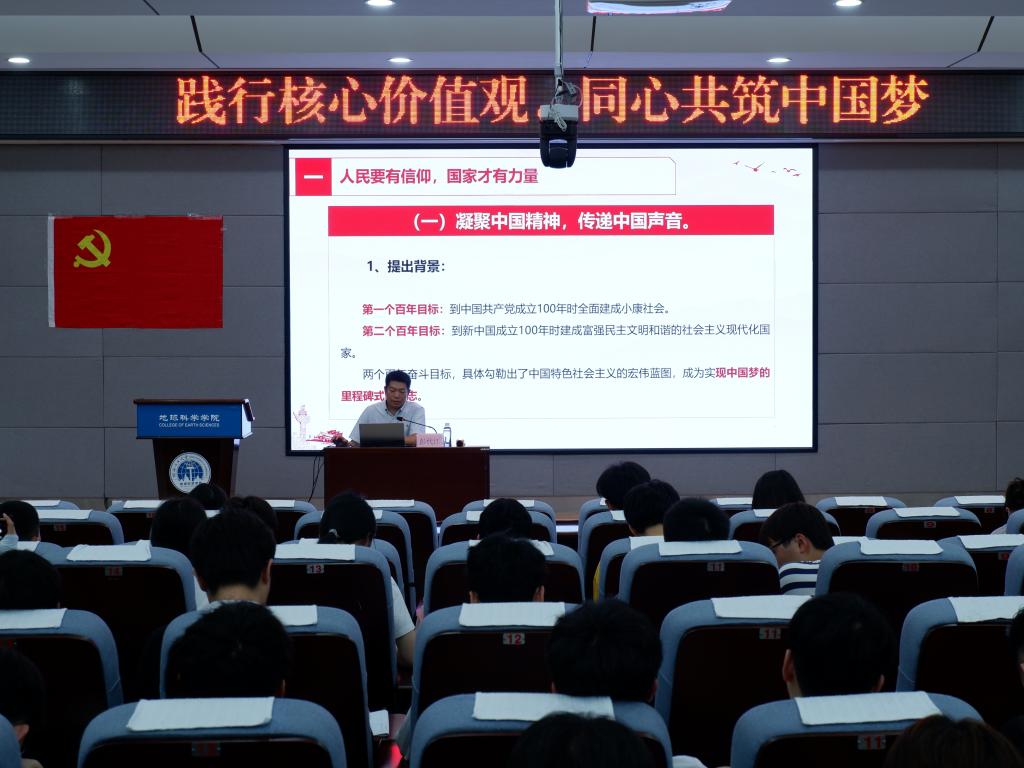 党委书记彭代江在地球与科学学院报告厅为预备党员讲授主题为《践行社会主义核心价值观,同心共筑中国梦》的党课。