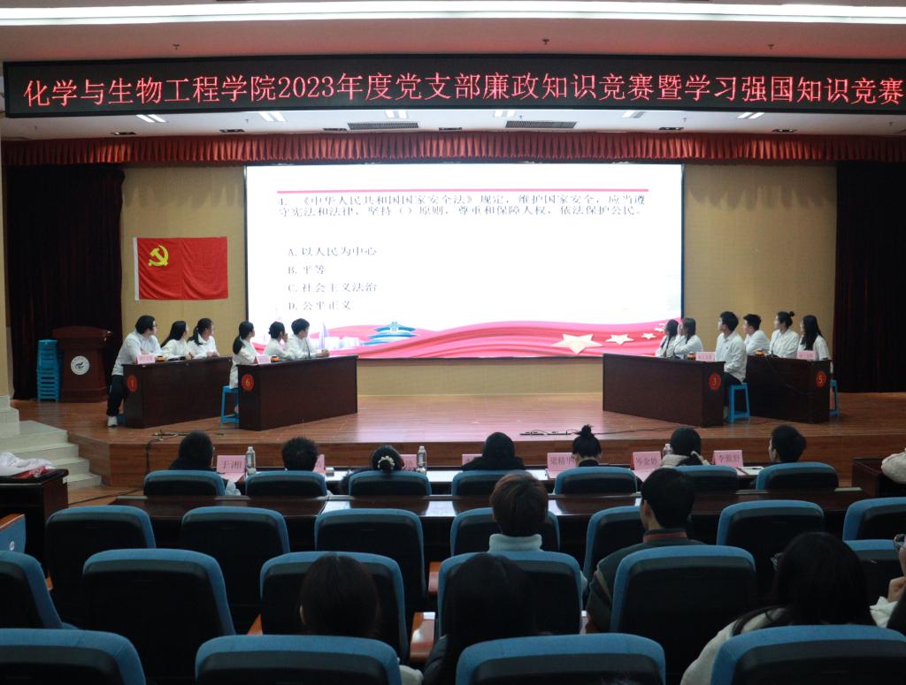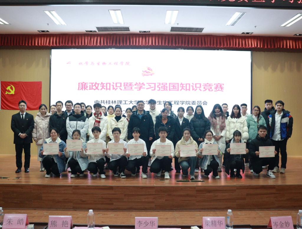 活动伊始,主持人介绍了本次出席活动的老师及活动目的。接下来,由李少华老师上台致辞并宣布知识竞赛正式开始。本次竞赛内容涵盖时事政治、法律法规、历史文化、科学常识等知识,分为积分赛、题型赛、总决赛三个环节,同时现场还有“猜猜我是谁”“红歌转转转”“我是幸运儿”等观众互动环节。竞赛中,各支部参赛选手冷静思考、沉着应答,上演了一场脑力与知识的较量,展现出扎实的理论知识基本功和奋发进取的精神风貌。答题环节结束后,经过紧张的统分环节,本科生第一党支部荣获一等奖;本科生第二党支部、本科生第四党支部荣获二等奖;研究生第四党支部、研究生第六党支部、研究生第二党支部荣获三等奖;本科生第三党支部、本科生第五党支部、研究生第一党支部、研究生第三党支部、研究生第五党支部荣获优胜奖。最后,出席活动的老师为获奖支部颁奖并合影留念。