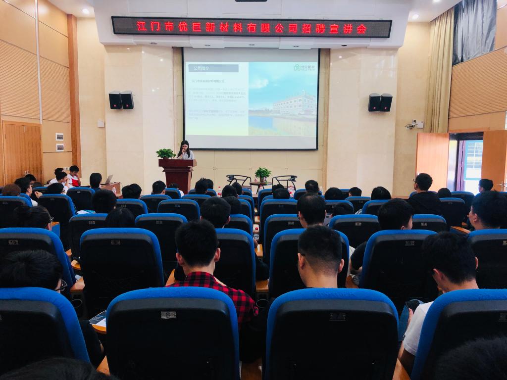 招聘会现场,公司人力资源代表、学院2013级毕业生杨思思,从江门市优巨新材料有限公司概况、培训发展、薪酬福利、招聘流程等方面做了详细介绍,并就同学们普遍关心的问题从毕业学姐的角度进行了解答。随后,进行了简历投递以及面试环节。