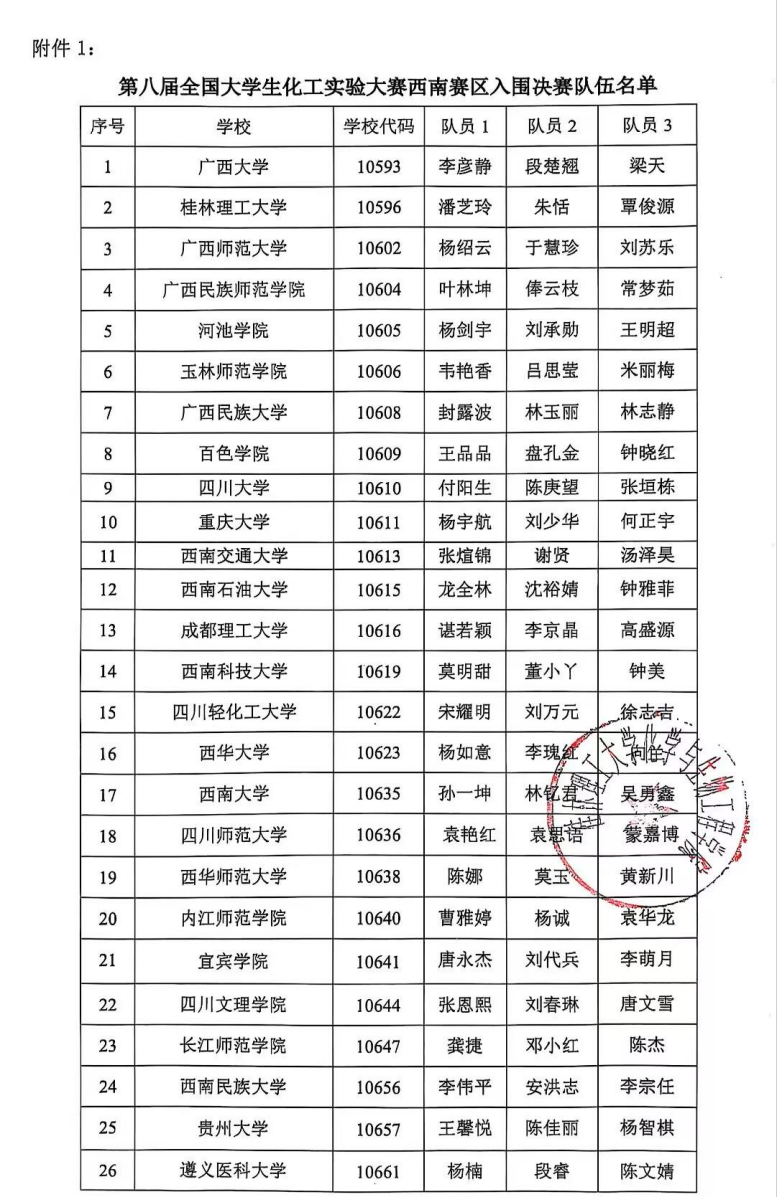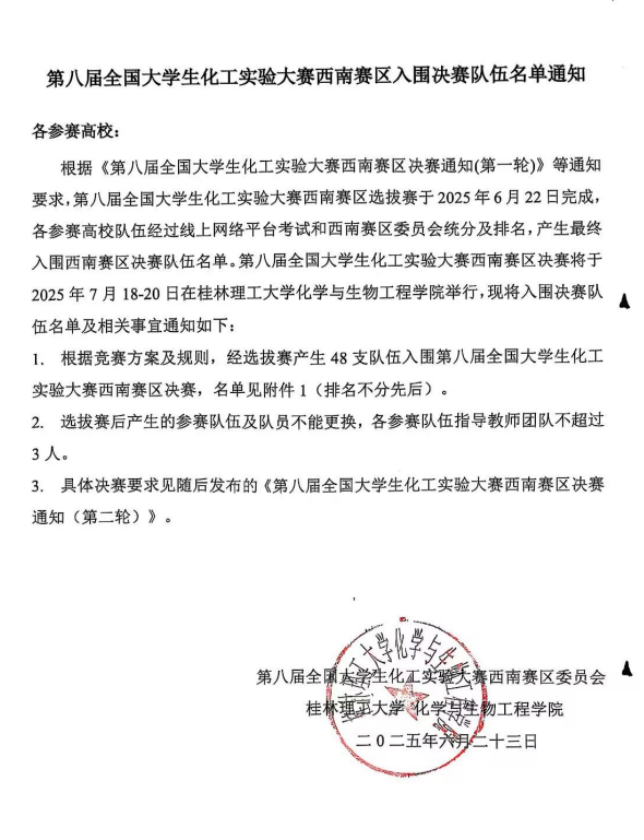 导航痕迹 当前位置: 私房俱乐部 >> 教育教学 >> 第八届全国大学生化工实验大赛西南赛区专栏 >> 正文 第八届全国大学生化工实验大赛西南赛区入围决赛队伍名单通知 【 发布日期:2025-06-24 浏览次数: 】 上一条:第八届“中控杯”全国大学生化工实验大赛西南赛区决赛通知 (第三轮)